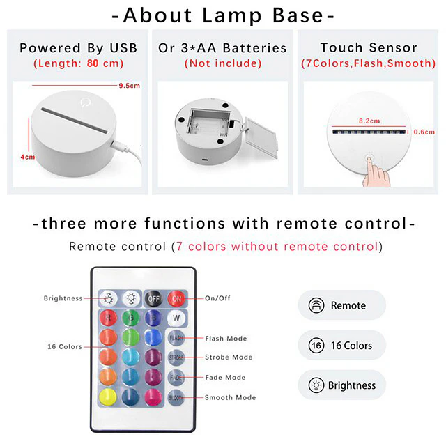 Esta lámpara está diseñada para encantar tu habitación y dejarte una impresión irrepetible. Esta lámpara tiene un único y moderno diseño, al mismo tiempo que es práctica y útil para la iluminación. Cuenta con 7 coloridos y maravillosos colores, y también permite la personalización con varias combinaciones, todo esto controlado desde el práctico control remoto. Es perfecta para usarla como decoración y se ve sumamente espectacular. Ya no busques más, La lámpara led 3D es la mejor elección para llenar tu casa de encanto y diversión. ¡No esperes más, descúbrelo ya!